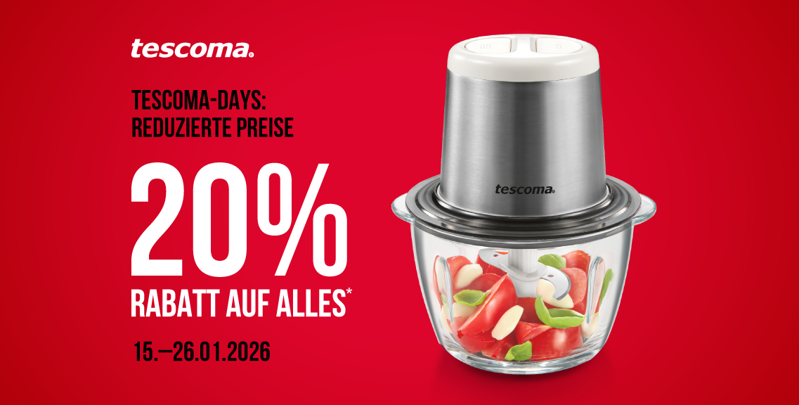 Jetzt ist der richtige Zeitpunkt, um die besten Angebote zu erkunden. Vom 15. bis 26. Januar 2026 erhalten Sie 20% Rabatt auf Einkäufe über 29€. Die TESCOMA DAYS finden in unserem Online-Shop statt.